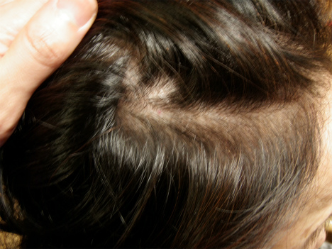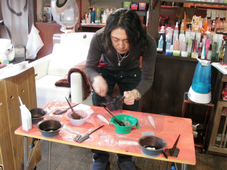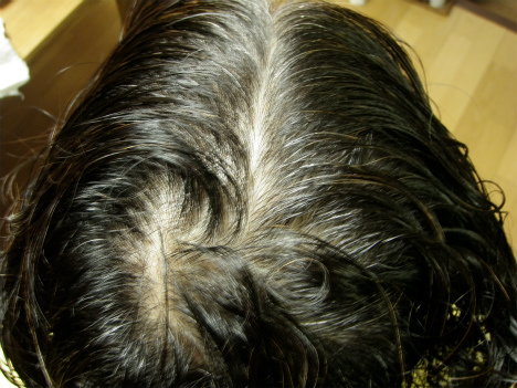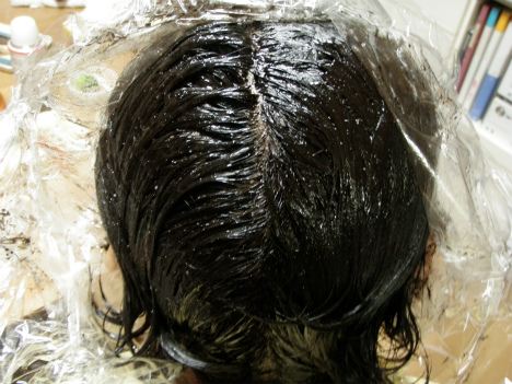 右はハーブカラー、地肌も奇麗になるので、頭皮につくように塗る(自分の頭なので擦り込むようにつける)。