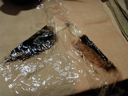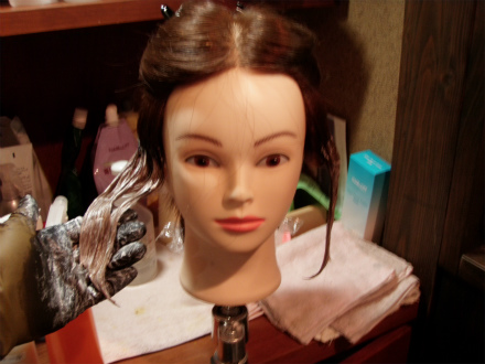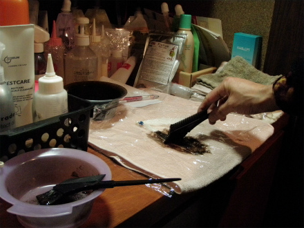 さらには、ダメ押しで、カラー、パーマ×2回の後にさらにまた、左に保護剤をつけて、1回目のカラーと同じく明るめの薬剤を塗布して、自然25分でシャンプー。