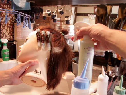 さらに、カラー、パーマと続けてした髪に、もう1度左に保護剤を塗り、ロットを19ミリ、2回転に変え、先程と同じパーマ工程。