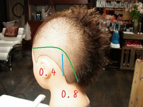 もみあげ部分0.4ミリ~額は0.8ミリへと、自然につながるようにカット。真ん中2つの矢印の先をよく見ると、2本ラインがみえます。0.4ミリで作ってあるラインです。