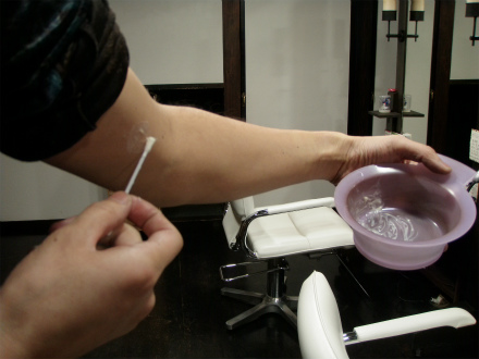 1,2剤を指定の割合で混ぜ(商品により異なることもありますので注意)てから、綿棒で腕の内側に10円硬貨ほどの大きさに薄く塗って自然乾燥。