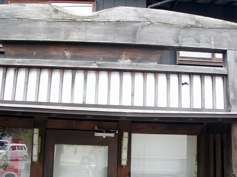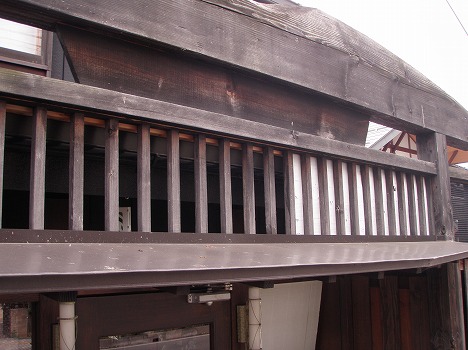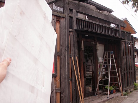 剥がしてみると、格子がはっきり。作ってもらったときは何も無かったのですが、いざ営業してみるとお客様にこの下でも雨が当たったので、格子部分を塞いで庇もつけたのです。