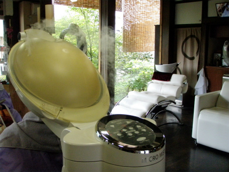 細かいミストの出る機械で加湿し栄養を髪の内部に入れていく。約10分時間を置いていきます。