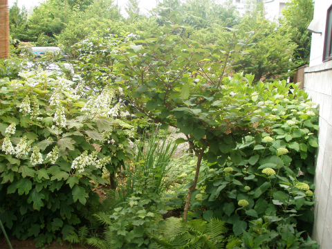 梅雨といえば、アジサイ。左のカシワバアジサイが咲き出しましたっ。