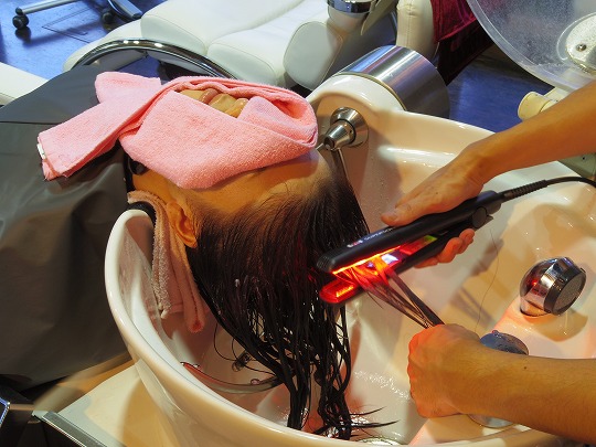 今回は毛髪改善コースで使用中の「超音波を発生させるアイロン」を使い、より髪の内部へ栄養を入れてみようかと思い、実験を。